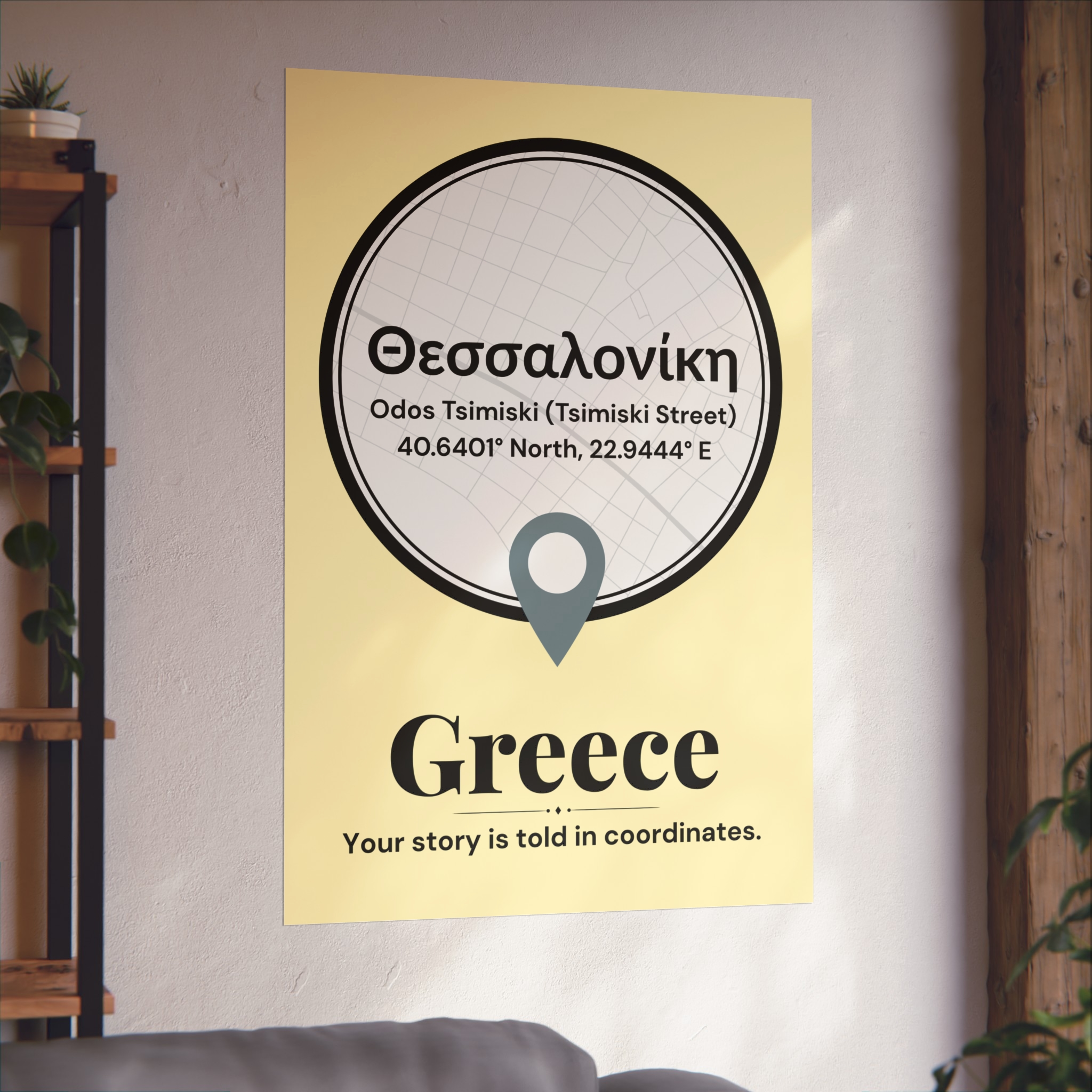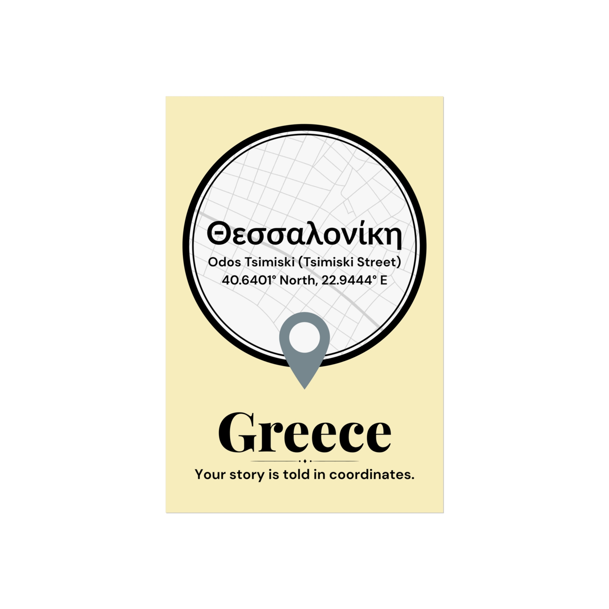 A sleek tribute to Thessaloniki’s vibrant street life, this poster features the famous Odos Tsimiski, one of Greece’s most popular shopping streets. The map design subtly directs focus to the city’s heart, highlighted by the precise coordinates, making it an ideal statement piece for any modern space.